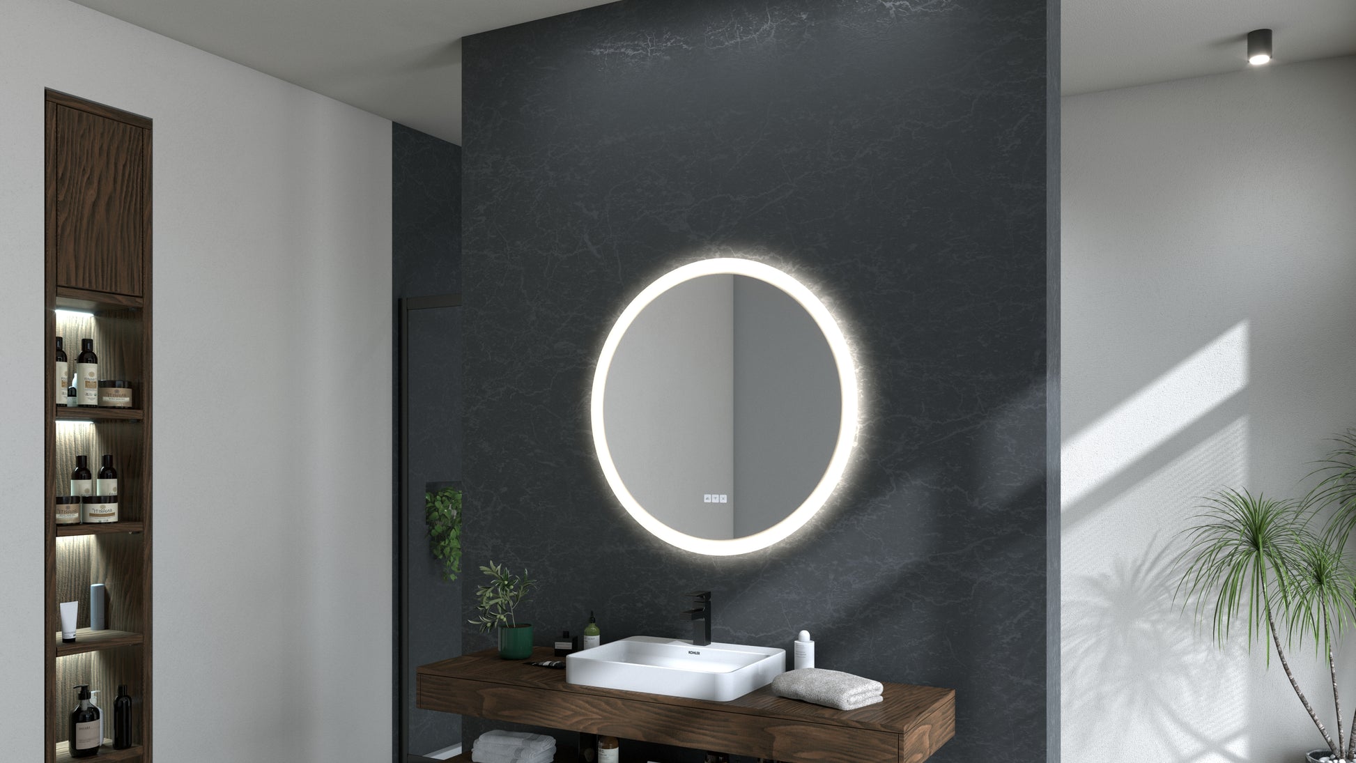 Our Round Full Frame Edge Frost LED mirror is a high-quailty mirror that will elevate any space. The light bar wraps all the way around the mirror and is flush with the edge, providing sufficient task lighting. And with 3 standard touch sensors, getting ready is easy. The on/off sensor not only turns the mirror on and off, but when held down, activates a dimming feature. The anti-fog sensor keeps a portion of your mirror steam free for up to an hour, and the color temperature sensor allows the choice between 3 color temperatures. Or, hold the button down to seamlessly switch between an array of warm to cool color options. Made with corrosion-resistant glass and long-lasting LED lights, this mirror is built to last.